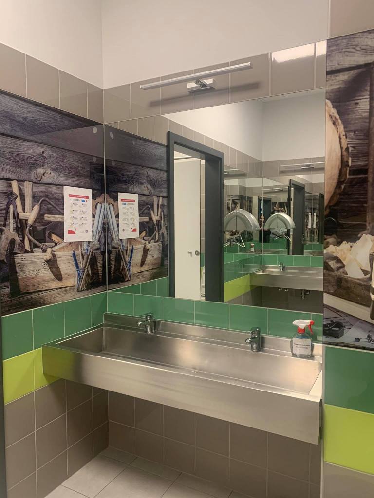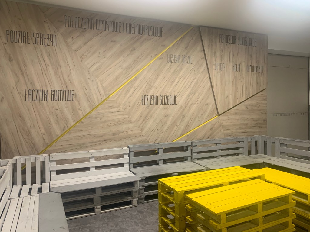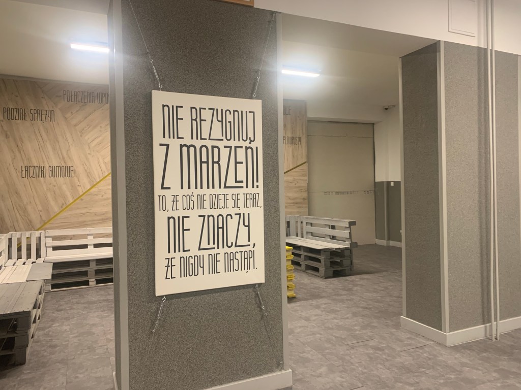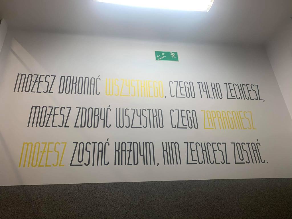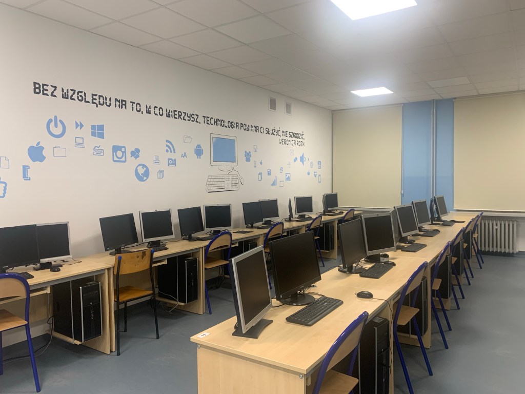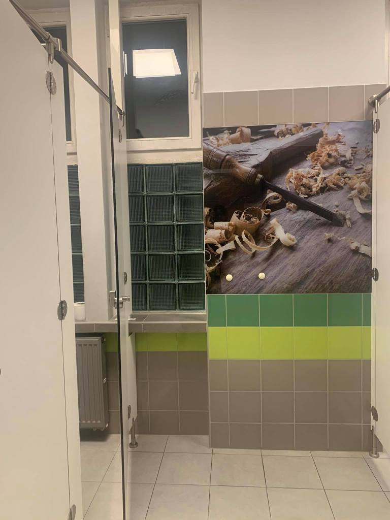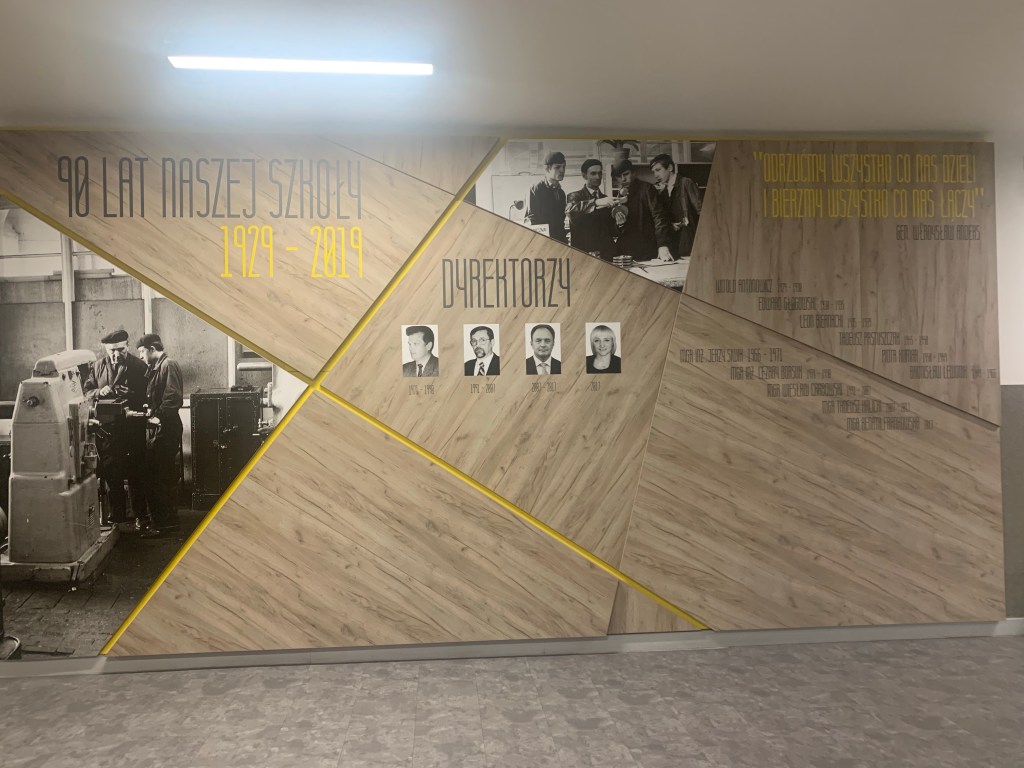 Od samego wejścia do budznku, gdzie mieści się estetyczna portiernia, a ze ściany spogląda na nas patron, czuję, że weszłam do placwki odbiegającej „standardom” typowej szkoły. Przekonuję się o tym w czasie zwiedzania szkoły, podziwiając bardzo estetyczną i spójną przestrzeń holi, korytarzy, gabinetów, sal i toalet, na dodatek osadzoną w tożsamości placówki – przede wszystkim motywach związanych z drewnem (technolog drewna to jeden z zawodów, które można tutaj zdobyć).