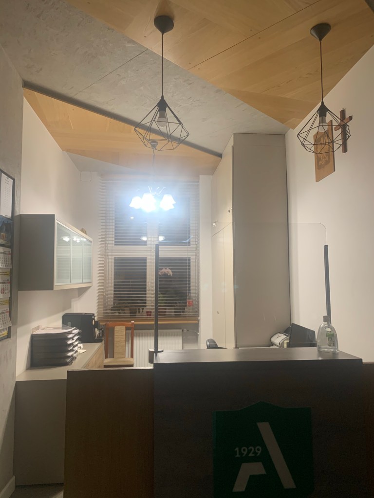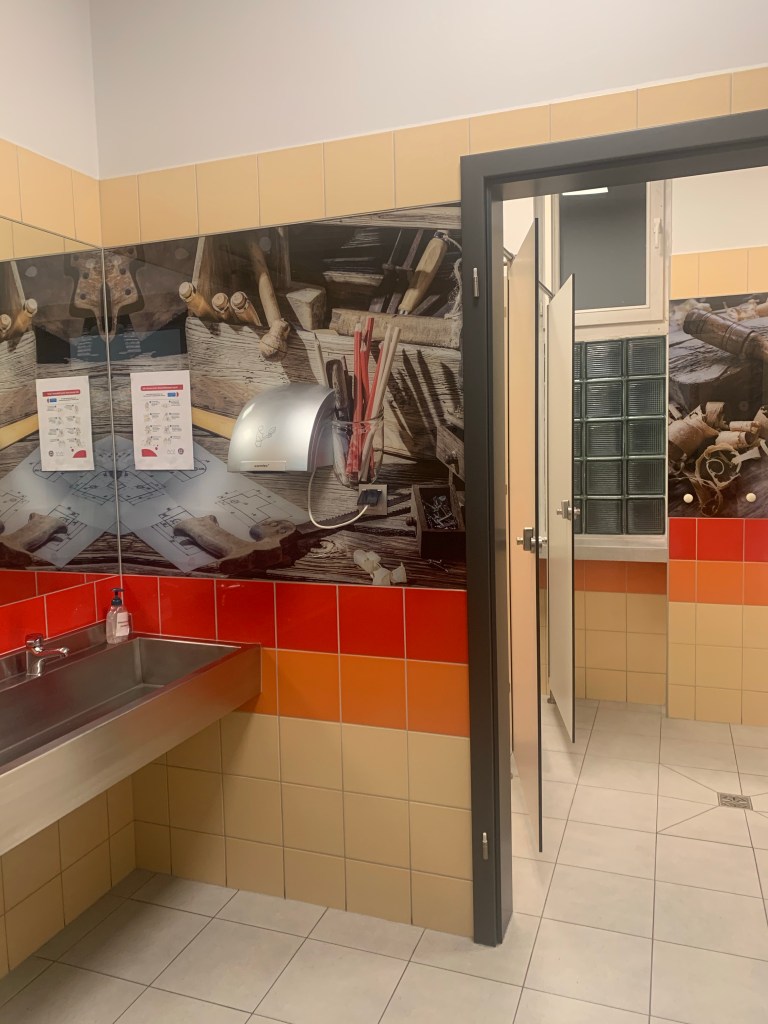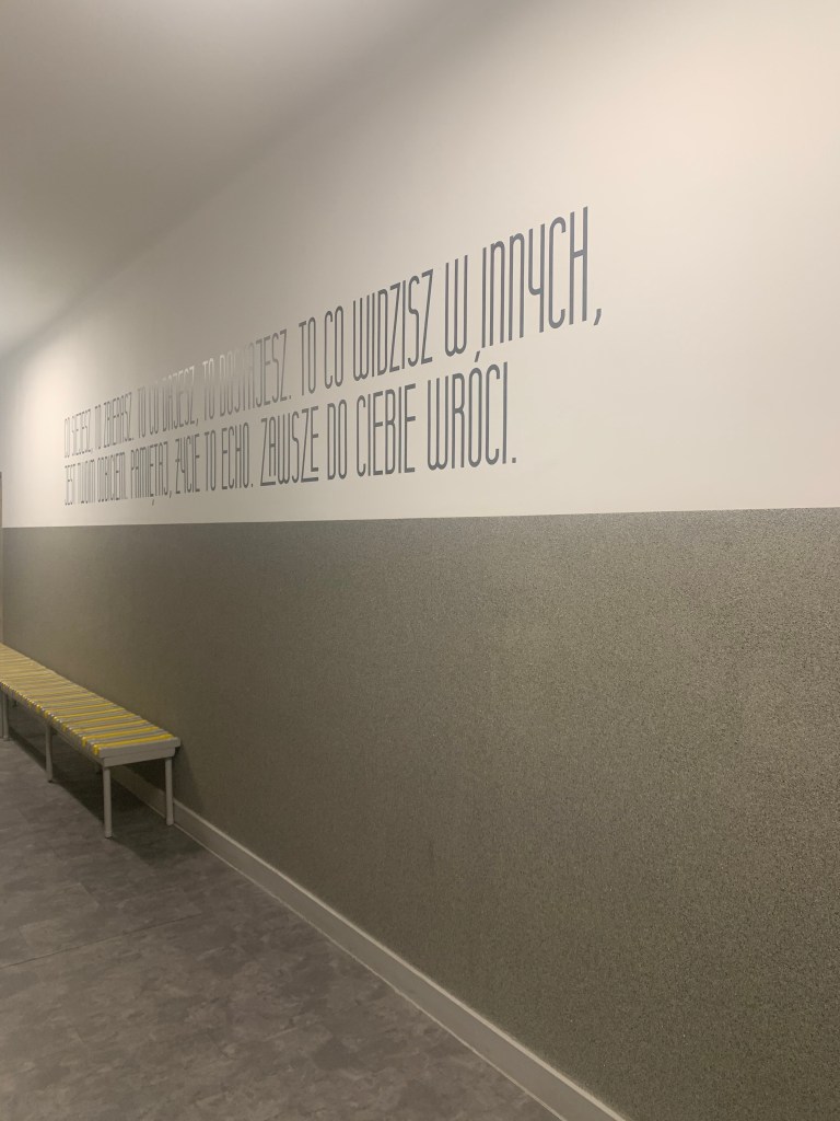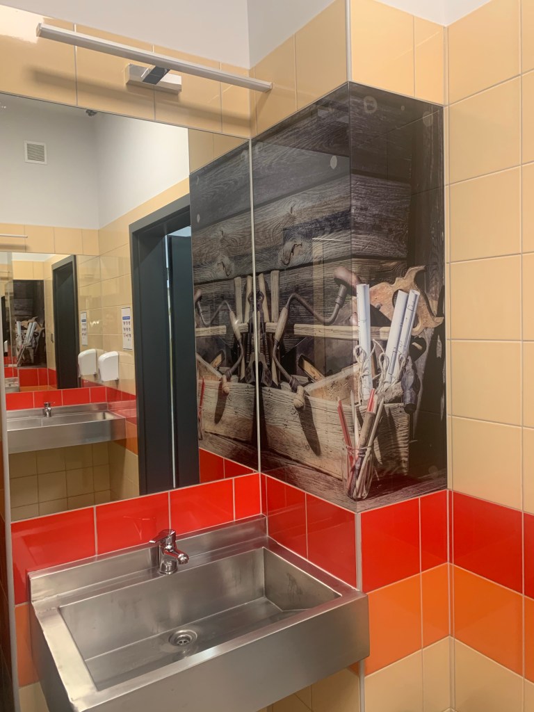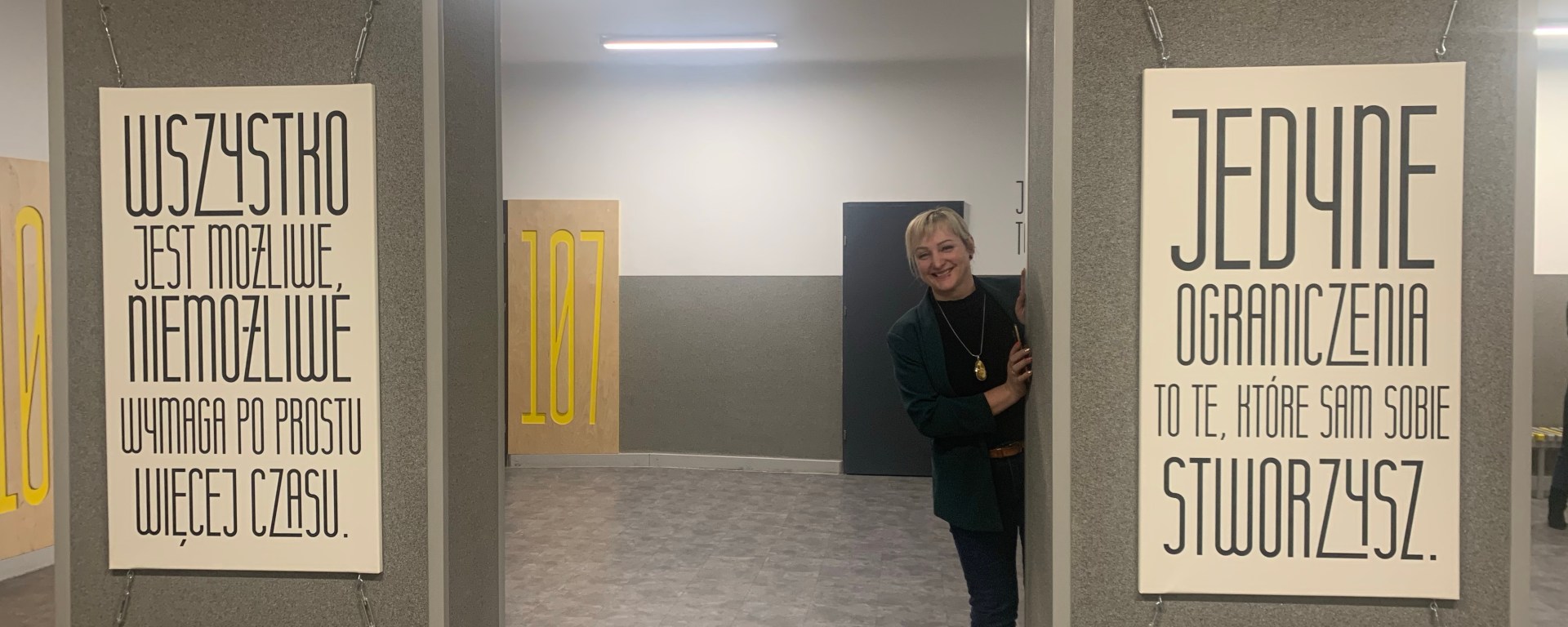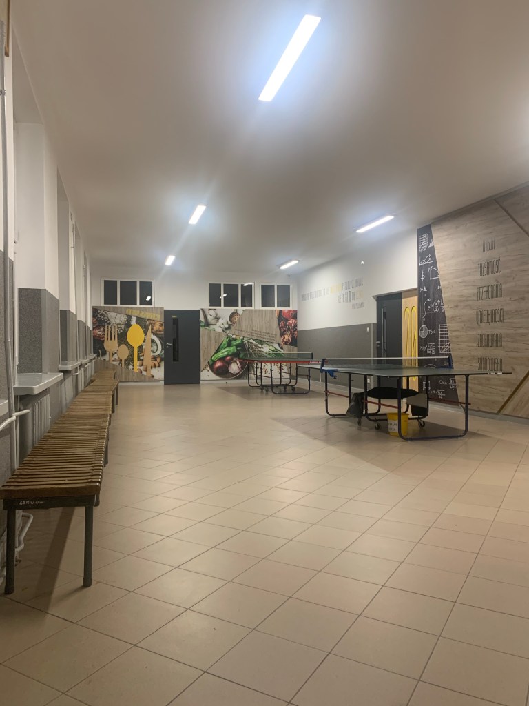 Od samego wejścia do budznku, gdzie mieści się estetyczna portiernia, a ze ściany spogląda na nas patron, czuję, że weszłam do placwki odbiegającej „standardom” typowej szkoły. Przekonuję się o tym w czasie zwiedzania szkoły, podziwiając bardzo estetyczną i spójną przestrzeń holi, korytarzy, gabinetów, sal i toalet, na dodatek osadzoną w tożsamości placówki – przede wszystkim motywach związanych z drewnem (technolog drewna to jeden z zawodów, które można tutaj zdobyć).