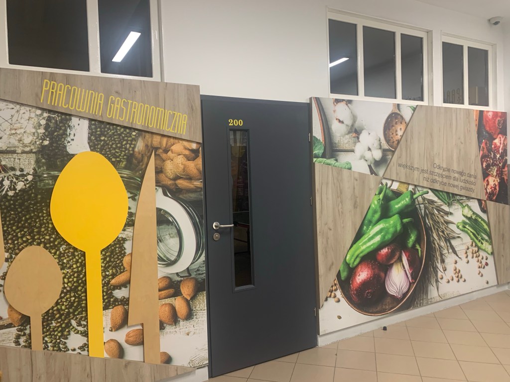 Przestrzeń edukacyjna obejmuje również miejsca praktycznej nauki zawodu. Ściany zdobią prace wykonane przez uczniów.