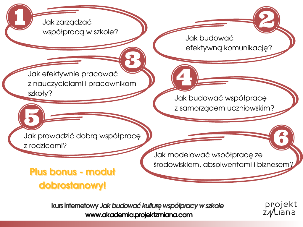 Dzisiaj z radością dzielę się z Wami zaproszeniem do udziału w kursie. Znajdziesz tam 9 nagrań i 24 karty pracy, a także infografiki, które możesz wykorzystać w codziennej pracy dyrektora, wicedyrektora i lidera. Zapraszam Cię do obejrzenia nagrania webinaru wprowadzającego do kursu i zapraszam w imieniu swoim i Artura do wspólnej pracy. W ramach dostępu do kursu oferujemy półroczne wsparcie webinarowe w zamkniętej grupie, a także kolejny pakiet materiałów. Sprawdź ofertę – kliknij – Akademia Rozwoju Kompetencji.